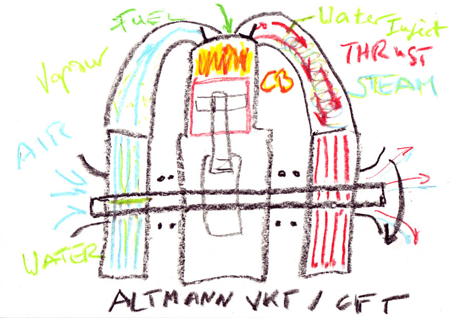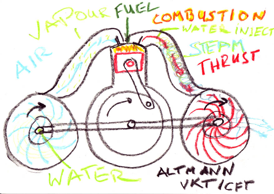 Instead of conventional heat exchange cooling (external cooling), the Altmann Combustion-Force-Turbine also employs evaporative internal cooling, which in turn creates steam-pressure to drive the diesel engine and even more steam-pressure to drive the exhaust turbine, thus making the Altmann CFT a combined gas- and steam-engine as well as a combined gas- and steam-turbine.