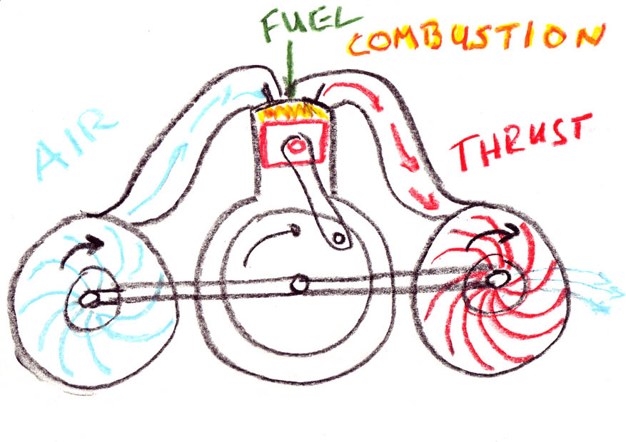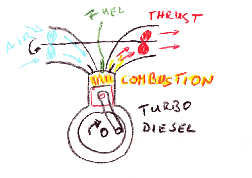 If we remove the combustion chamber out of the gas turbine and replace it with a diesel engine, we have a combustion-chamber (the diesel) that is able to generate mechanical power itself. The combustion is now of the interrupted explosive type. The exhaust gas of the diesel engine gives thrust for the turbine (red), which in turn moves the compessor (blue). The diesel drive shaft (crank) and the compressor-turbine drive shaft are unconnected and rotate independently (the turbine rotates much faster than the diesel). Still a lot of thrust and heat are lost into the atmosphere. And yes, this is exactly the principle of a turbo-charged diesel engine.