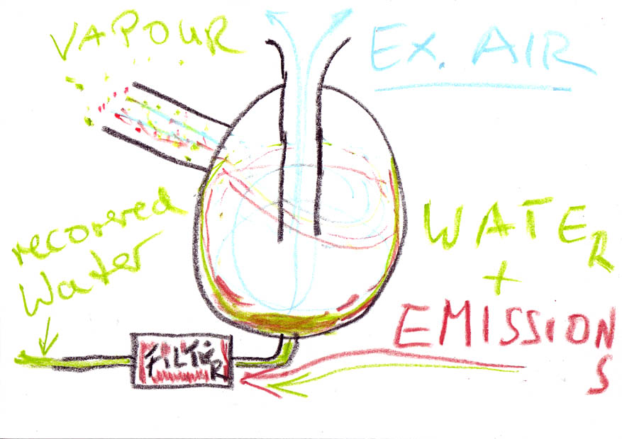 At the bottom of the egg, water and trapped emissions flow through a pipe to a filter, in which all the fine dust is filtered and pure water is recovered for further internal cooling/ steam-generation.