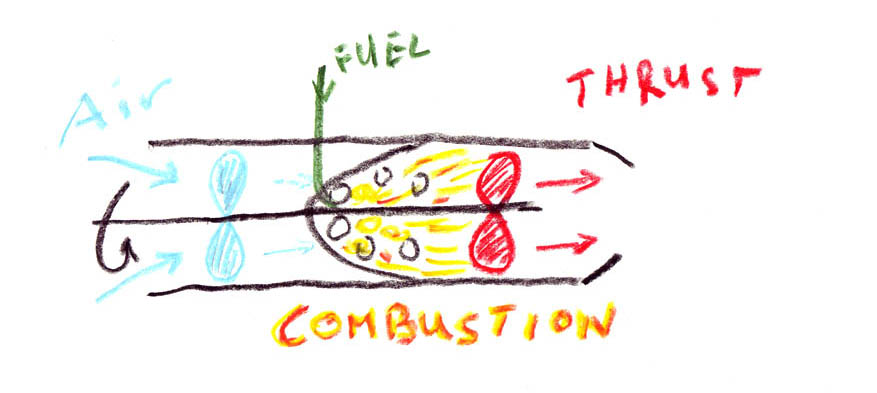 The basic gas turbine consists of 3 things: the compressor (blue), the combustion (yellow) chamber and the turbine (red). The compressor and turbine wheel are on the same shaft. Compressed air enters the combustion chamber through holes, is mixed with fuel and ignited (spark plug not shown). Exhaust drives the turbine, which in turn drives the compressor and results in an uninterrupted combustion. ... The gas turbine generates thrust and heat. Also mechanical power is generated by the turbine to drive the compressor.