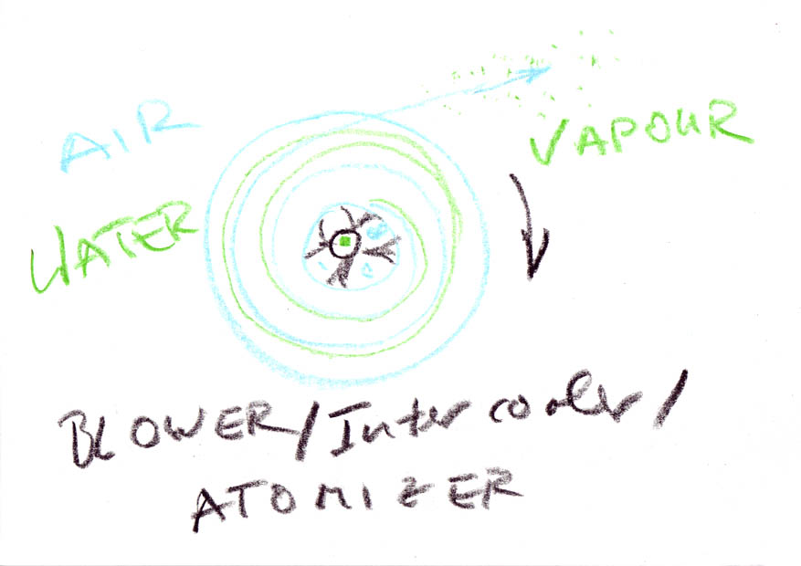 As all the intake air is also blown through the same discs there will be a very powerful cooling effect on the intake air, without causing any flow restriction. Unlike a conventional intercooler (which does restrict air flow) the compressor of the Altmann VKT uses the above explained evaporative cooling which is much more efficient in cooling and does not restrict air flow. An adjustable amount of finely atomized water will enter the diesel intake together with the super-cooled air.